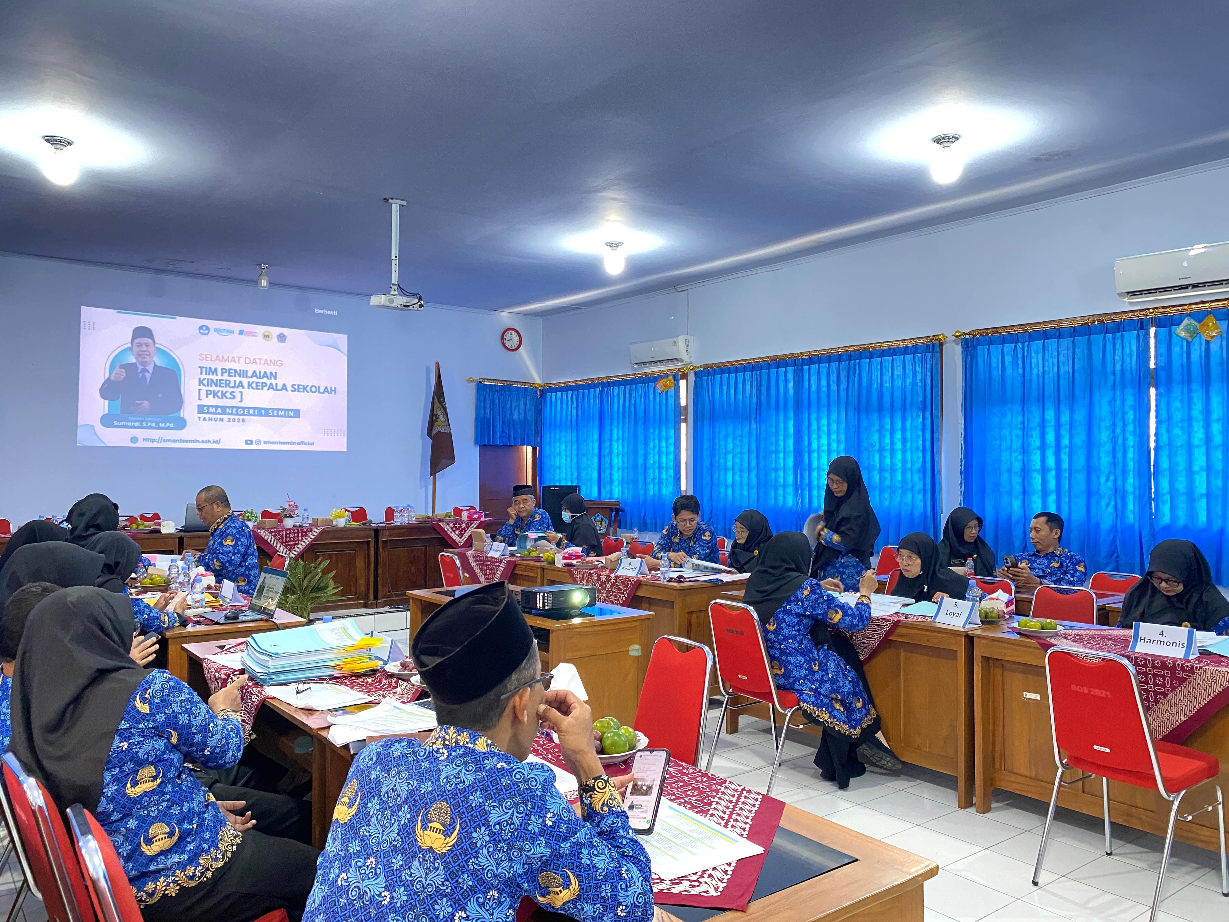 Semin, 10 November 2025 — SMAN 1 Semin melaksanakan kegiatan Penilaian Kinerja Kepala Sekolah (PKKS). Kegiatan ini merupakan agenda rutin tahunan yang bertujuan untuk menilai dan mengevaluasi pelaksanaan tugas, tanggung jawab, serta kompetensi kepala sekolah dalam memimpin dan mengembangkan satuan pendidikan. Proses penilaian dilakukan oleh tim penilai dari Balai Pendidikan Menengah Kabupaten Gunungkidul. Dalam pelaksanaannya, tim penilai mencermati secara menyeluruh seluruh bukti dukung dari masing-masing aspek penilaian, guna memastikan kesesuaian antara dokumen dan pelaksanaan nyata di lapangan. Adapun aspek yang dinilai meliputi Berorientasi Pelayanan, Akuntabel, Kompeten, Harmonis, Loyalitas, Adaptif, dan Kolaboratif — yang merupakan nilai dasar ASN BerAKHLAK. Melalui aspek-aspek tersebut, penilaian tidak hanya menyoroti kinerja administratif, tetapi juga menilai integritas, profesionalitas, dan dedikasi kepala sekolah dalam menjalankan peran kepemimpinan pendidikan.