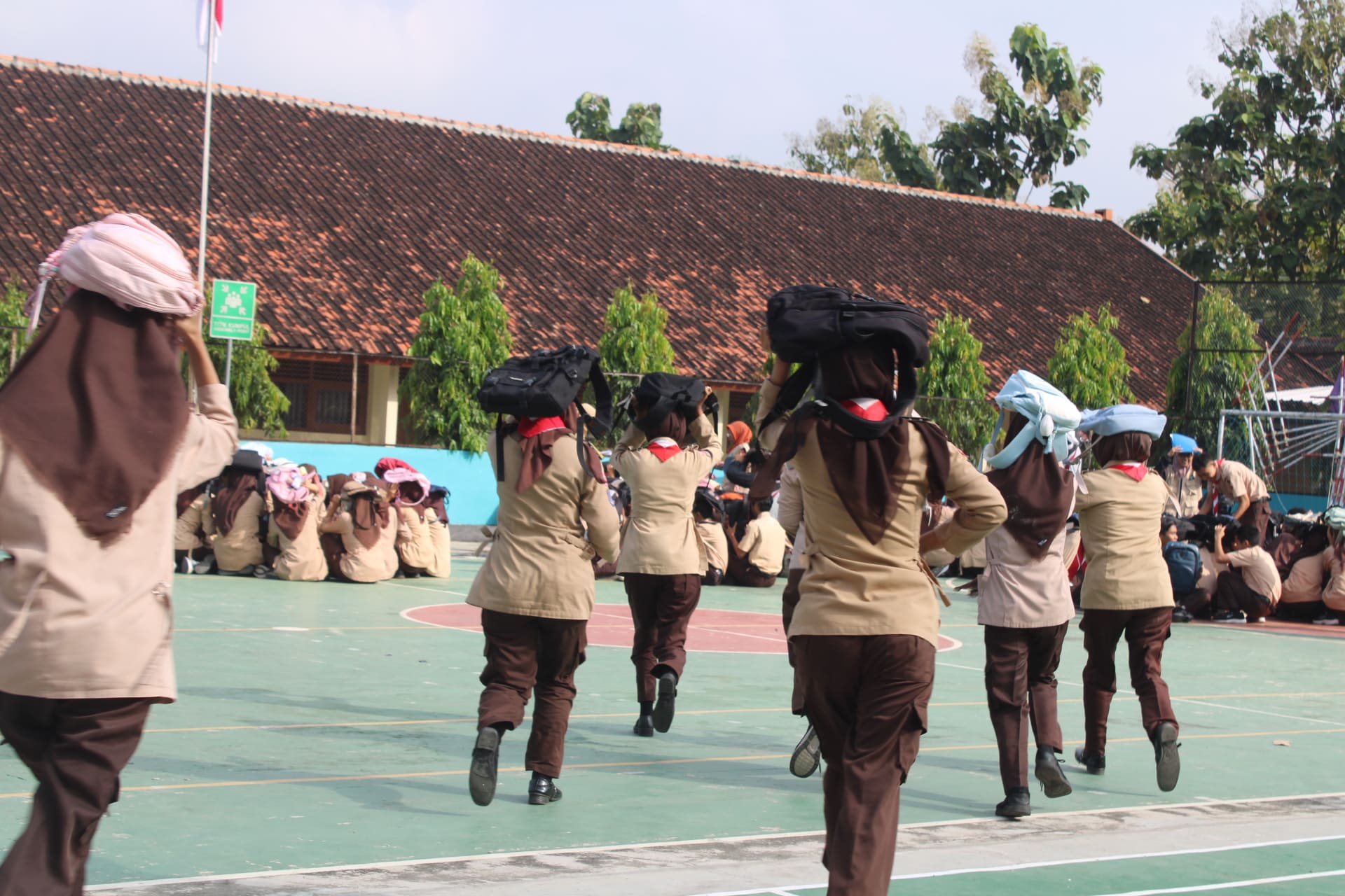 Dalam simulasi yang dilaksanakan, diskenariokan bahwa gempa bumi terjadi saat proses kegiatan belajar mengajar sedang berlangsung di dalam kelas. Ketika sirine dibunyikan sebagai tanda terjadinya gempa, para siswa yang sedang mengikuti pelajaran langsung diarahkan oleh guru untuk tetap tenang dan melakukan langkah perlindungan diri dengan berlindung di bawah meja sambil melindungi kepala.Setelah getaran dinyatakan berhenti, guru kemudian menginstruksikan siswa untuk keluar kelas secara tertib melalui jalur evakuasi yang telah ditentukan. Para siswa berjalan dengan rapi tanpa berlari menuju titik kumpul di lapangan sekolah. Di lokasi tersebut, dilakukan pendataan untuk memastikan seluruh siswa dan guru telah berada dalam kondisi aman.