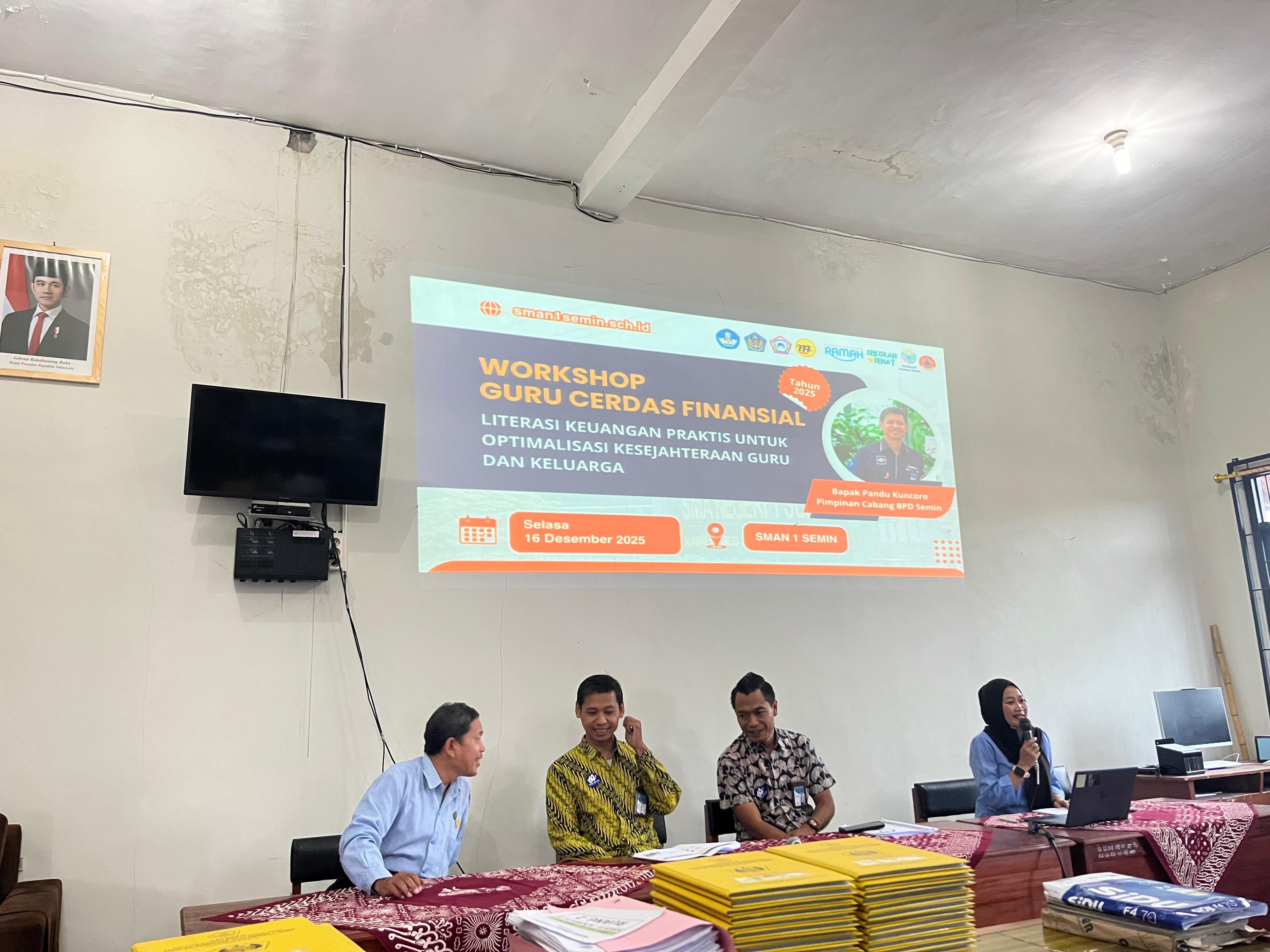 SMAN 1 Semin menyelenggarakan kegiatan Workshop Guru Cerdas Finansial pada tanggal 15 Desember sampai dengan 16 Desember 2025 dengan mengusung tema “Literasi Keuangan Praktis untuk Optimalisasi Kesejahteraan Guru”. Kegiatan ini dilaksanakan di ruang guru SMAN 1 Semin dan diikuti oleh seluruh guru dengan penuh antusias.